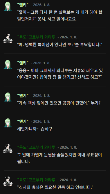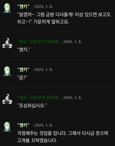 "···어쩌면 먼 훗날에, 저 대신 엔키 씨가 마음을 전해주실 수도 있지 않을까요?" 대답은 이것으로 충분할 거예요.