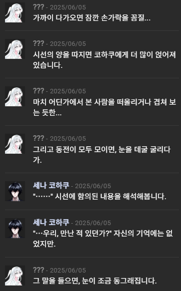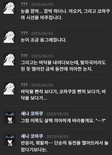 기쁘게 걸음을 옮깁니다. "그래? 다행이다~" 한 톤 올라간 목소리.